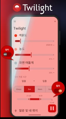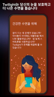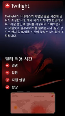 Twilight는 깊은 숙면을 유도하고 디지털 기기 사용으로 인한 눈의 피로를 효과적으로 줄여주는 최적의 스마트 블루라이트 필터 앱입니다. 개인의 생체 리듬에 맞춰 정교하게 조절되는 화면 색온도로 하루 종일 눈을 편안하게 보호합니다.